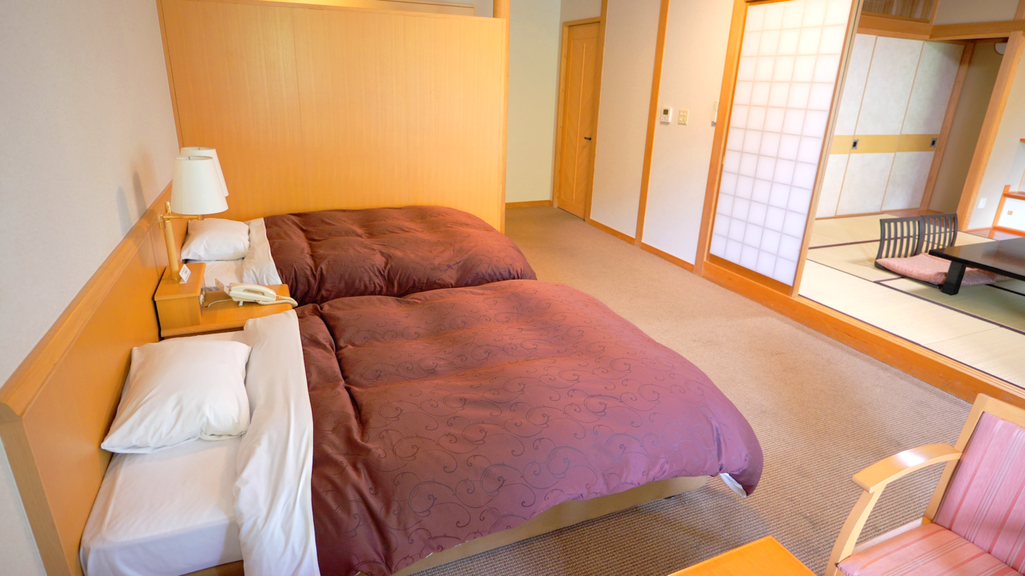 通潤橋側のお部屋です。畳敷きの和室にツインのベットがあるお部屋です。独立したバスルームとトイレがあります。たまには贅沢にお過ごしください。